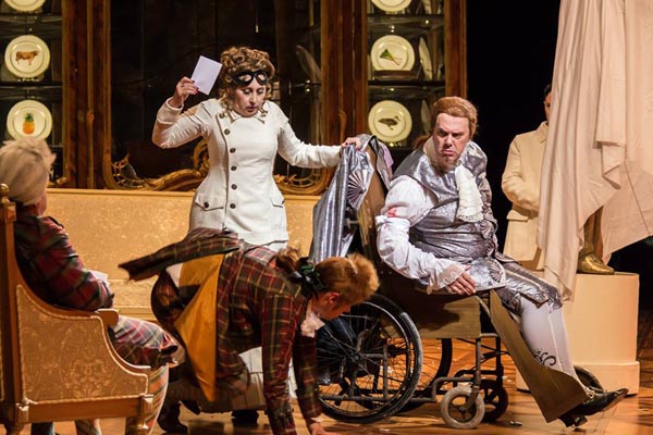 Второй акт – буржуазный, мы в гостях у «новых австрийцев», Фаниналей. Здесь свой масскульт: уютный бидермайер. Стеклянные горки с посудой, которую вдруг начинают бить – и я каждый раз втайне надеюсь, что разлетается на куски фаянс от «Икеа», а не севрский фарфор, тайно перекочевавший сюда из первого акта. И постановщики не подводят: ни одна тарелка из горок Фананаля не пострадает в их спектакле никогда! Это тоже маркер. Маркер нашей внутренней буржуазности, заставляющей сочувствовать Фаниналю, а не претенденту на руку его дочери Софи.